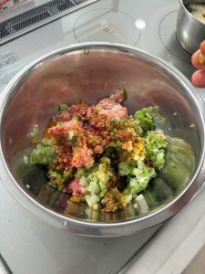 白菜が冷めたら(熱いから気を付けて)水気をよく絞ってひき肉300gと混ぜ、オイスターソース大さじ1、鶏がらスープの素小さじ1、卵1個を加え、粘りが出るまでよく混ぜます。