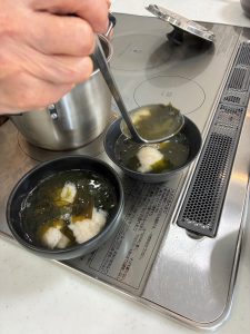 だし汁にポトンとゆっくり落とすとお団子になりますよ。